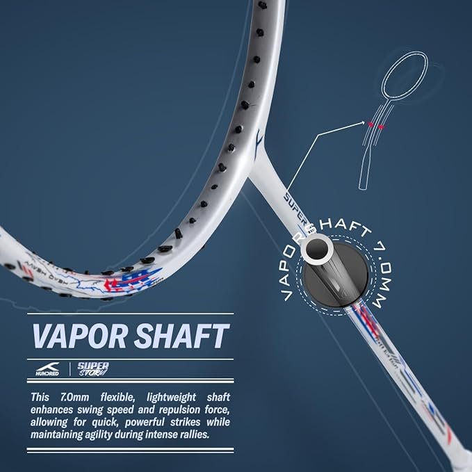 The Super Storm racket blends lightweight design with head-heavy attacking power, featuring advanced nanotechnology and Japan-made graphite for strength, control, and durability. Every shot delivers unmatched speed and precision.